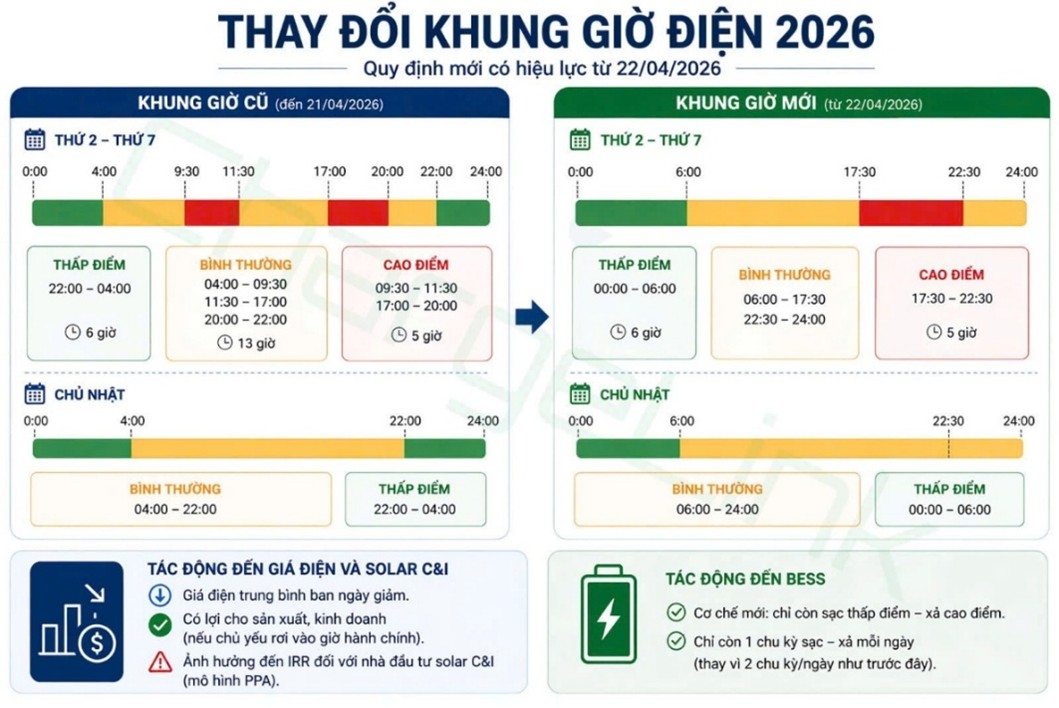 Sự điều chỉnh này khiến khung giờ cao điểm nằm hoàn toàn ngoài khoảng thời gian bức xạ mặt trời hữu dụng. Do đó, các dự án điện mặt trời mái nhà (ĐMTMN) không còn tận dụng được giá điện cao điểm để tối ưu nguồn thu, đặc biệt là với mô hình ĐMTMN có bán điện cho nhà máy với mức chiết khấu cố định.