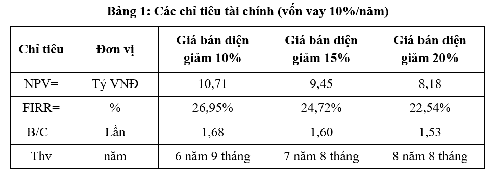 Chi phí đầu tư hiện tại vào khoảng 13,01 tỷ đồng/MWp, sản lượng điện của dự án chia thành 3 khung khác nhau, Giờ cao điểm: 311 MWh/năm, giờ bình thường: 875 MWh/năm, vào ngày lễ, chủ nhật: 247 MWh/năm. Theo QĐ 648/2019/QĐ-BCT của BCT thì giá bán điện cho 2 khung giờ cao điểm và bình thường lần lượt là 3.076 đồng/kWh và 1.685 đồng/kWh. Phần sản lượng điện trong các ngày lễ, chủ nhật được bán lên lưới với tỉ lệ phát 20% cùng giá bán ước đạt 1.361 đồng/kWh. Nếu Nhà đầu tư bỏ ra 30% TMĐT và vay ngân hàng 70% TMĐT với lãi suất 10%/năm thì trong vòng 20 năm hoạt động, dự án sẽ thu về giá trị hiện tại ròng NPV là 9,45 tỷ VNĐ, thời gian hoàn vốn chỉ 7 năm 8 tháng và chỉ số IRR lên tới 24,72%.